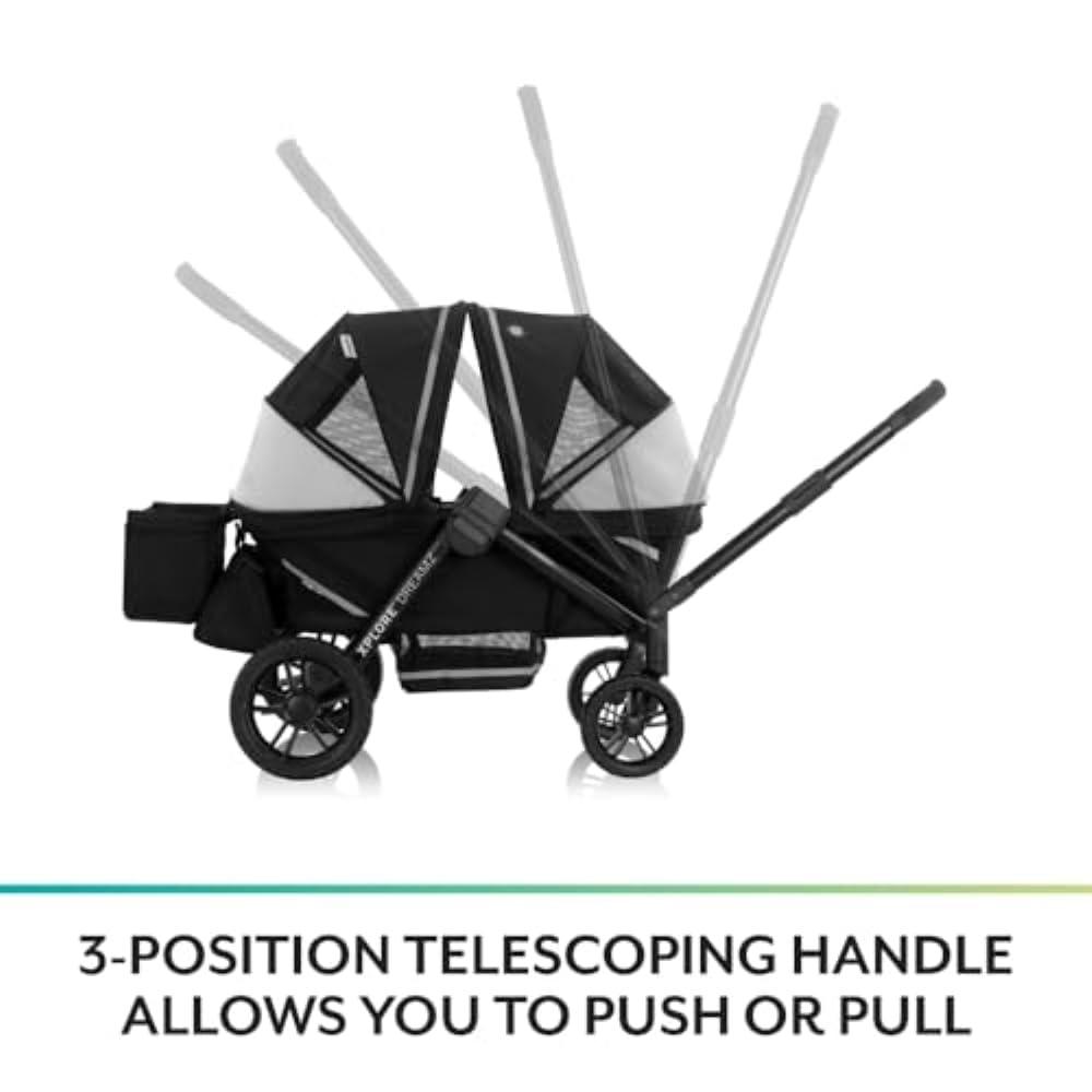 Adventuring can take a lot out of a little one! Be ready for naptime on the go with the Pivot Xplore™ Dreamz All-Terrain Stroller Wagon with Bassinet Insert. Designed for children from 6 months to 33 lb, the bassinet insert lets your little one take a break from the action comfortably, then tucks out of the way until the next catnap. This all-terrain ride accommodates up to two children ages 6 months to 5 years, with each seat holding a child up to 55 lb (110 lb total). As with our bestselling Pivot Xplore, the Xplore Dreamz transforms with a flip of the three-position, telescoping handle, allowing you to push as a stroller or pull as a wagon even as your child nods off in the bassinet insert. Larger UPF 50+ canopies expand from 2 to 3 panels with a quick unzip to help protect your child against the sun’s harmful rays, while breathable mesh helps to keep naptime comfortable. A newly extended footwell gives energetic little legs extra room. With 3-point harness secured, the rugged, all-terrain wheels take your family adventure from pavement to beach and beyond, while the wagon’s 27 in. width fits through most doorways with ease. For more flexible seating, the Xplore Dreamz accepts a toddler seat or infant car seat adapter (both sold separately). To keep little gigglers busy, the included BPA-free child tray features two cup holders. Mesh pockets store snacks, toys and items you want to keep within reach. An additional, detachable storage basket includes pop-out cup holders for adults. Elastic straps on the side of the wagon hold everything from umbrellas to water bottles to keys. The front of the wagon drops down with the press of a button for easy in and out. Quick, easy, compact fold makes your Xplore Dreamz a breeze to pack up for travel. From adventure to naps, you’re ready for a full day of fun.