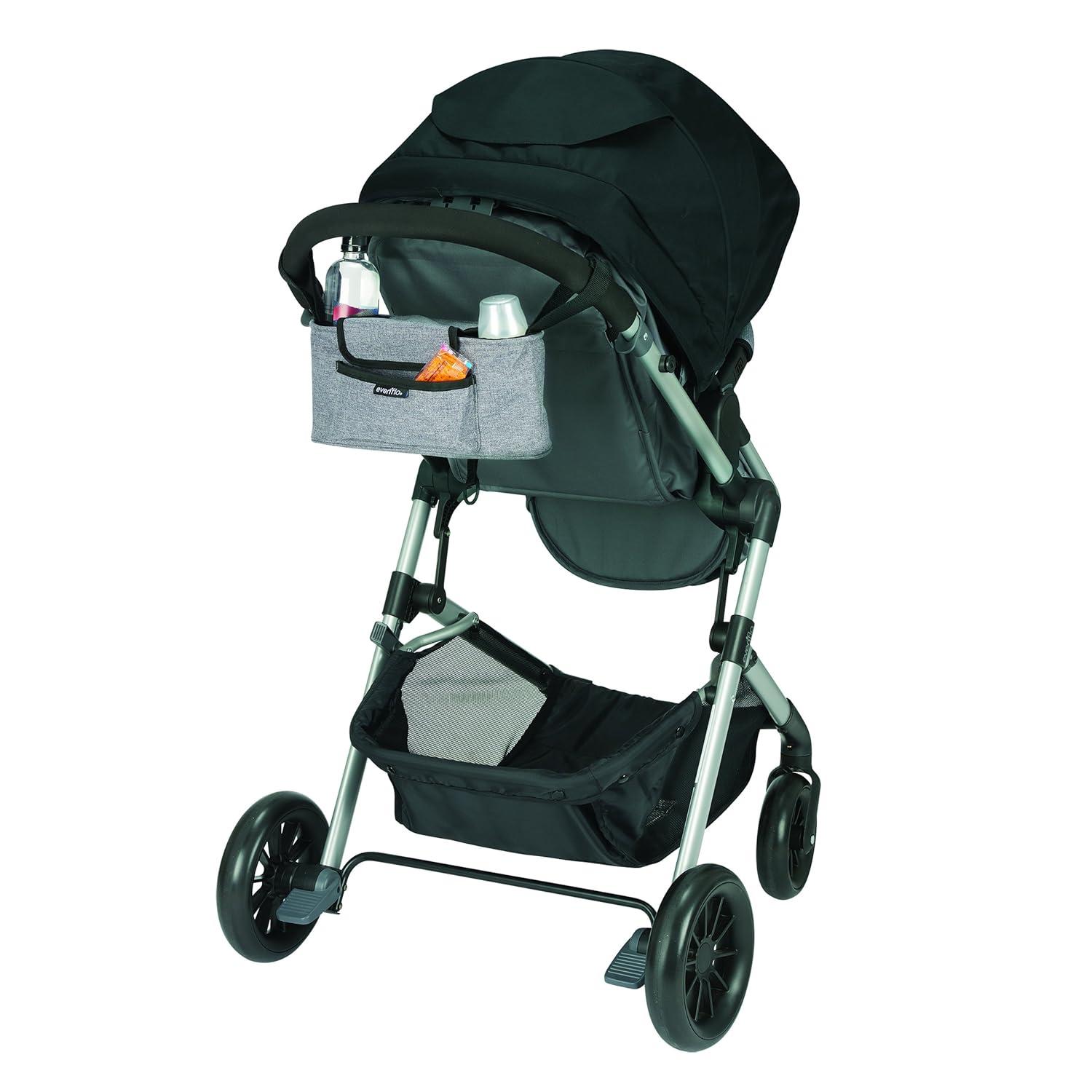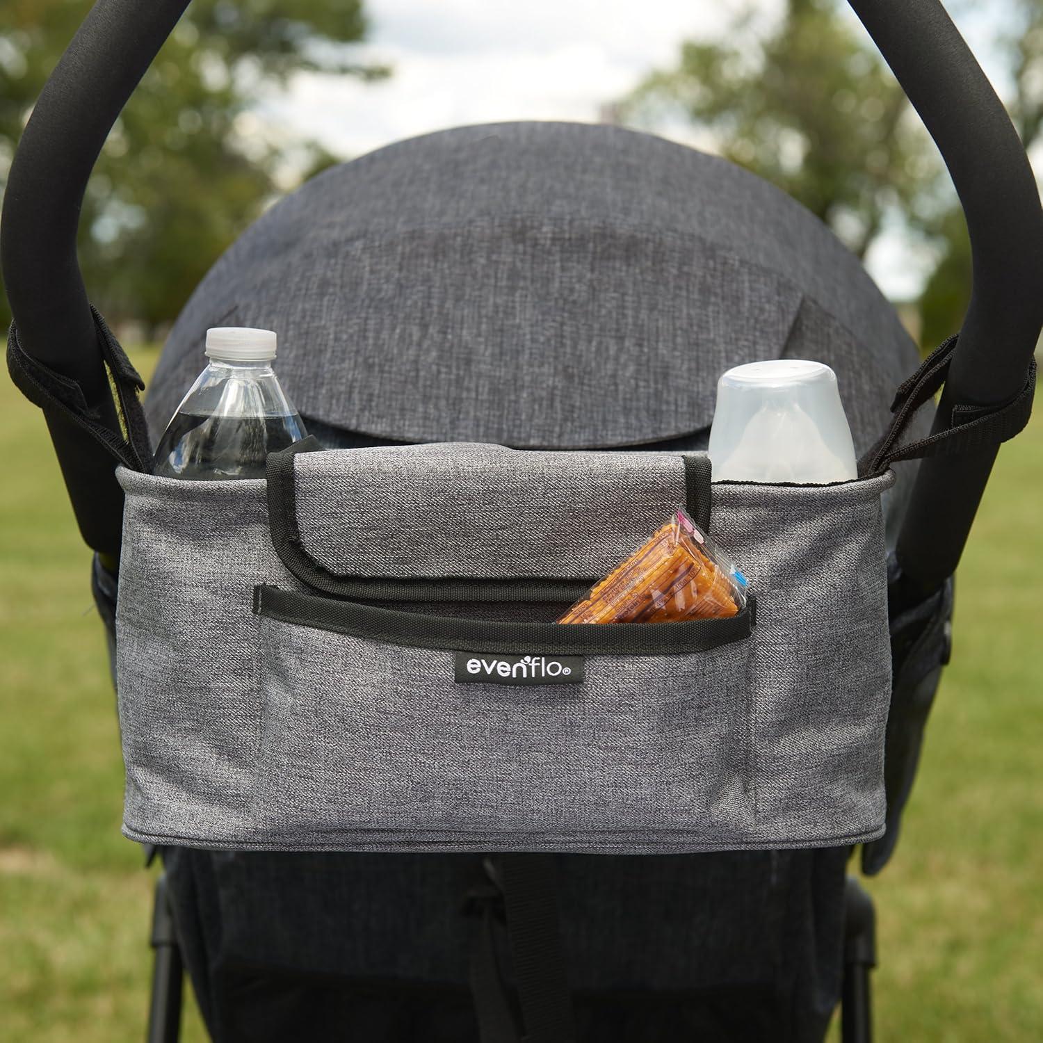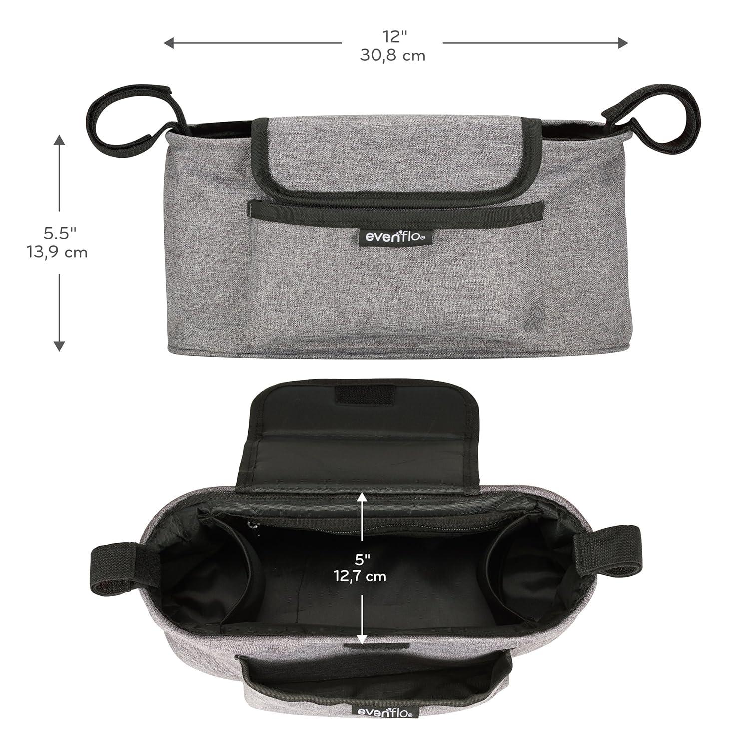 All the storage you need for your on-the-go essentials. The Evenflo Universal Stroller Organizer features fully-adjustable side Velcro straps that allow you to quickly and easily secure the organizer to most strollers. The secret interior mesh pocket with zipper is ideal for stashing keys, money or cards. Two neoprene lined pockets on each side are perfect for keeping your beverages spill-free and close at hand. The large capacity interior pocket is covered with a self-fabric flap and Velcro closure for security. Additional easy-access exterior pocket keeps snacks and other must-haves within reach. High quality materials are easy to wipe clean, ensure durability and eliminate stretching or shrinking.